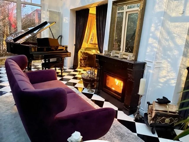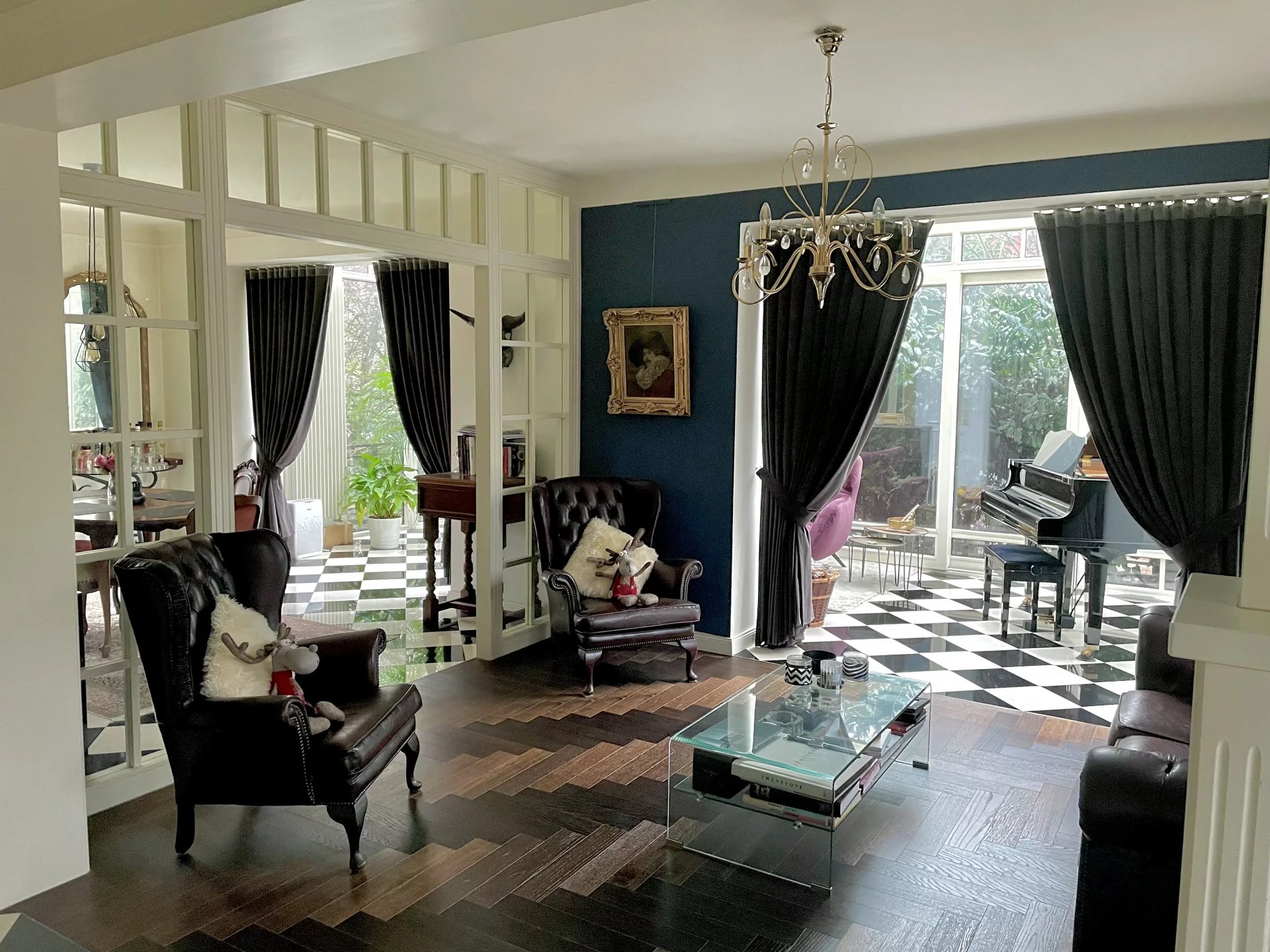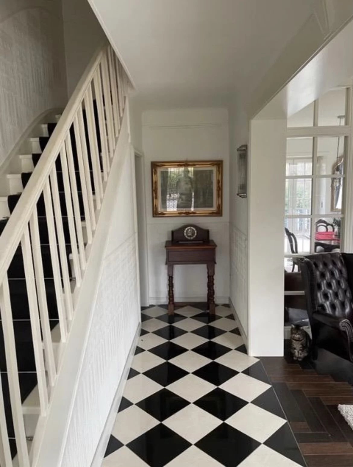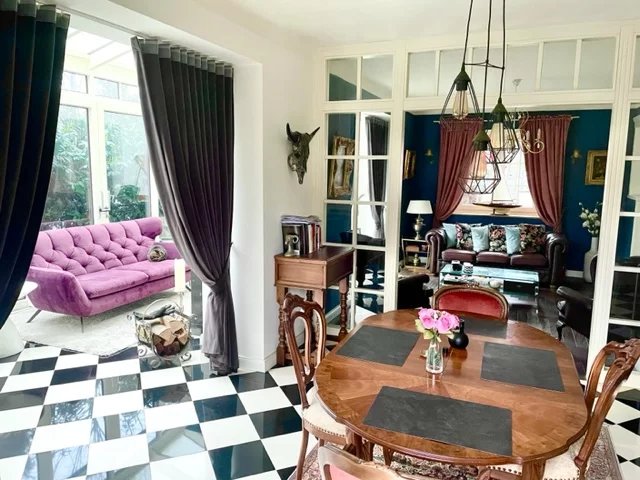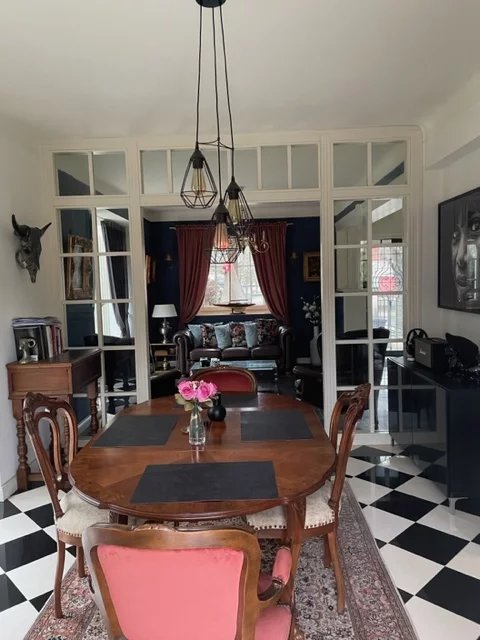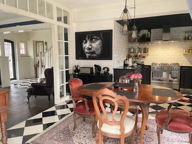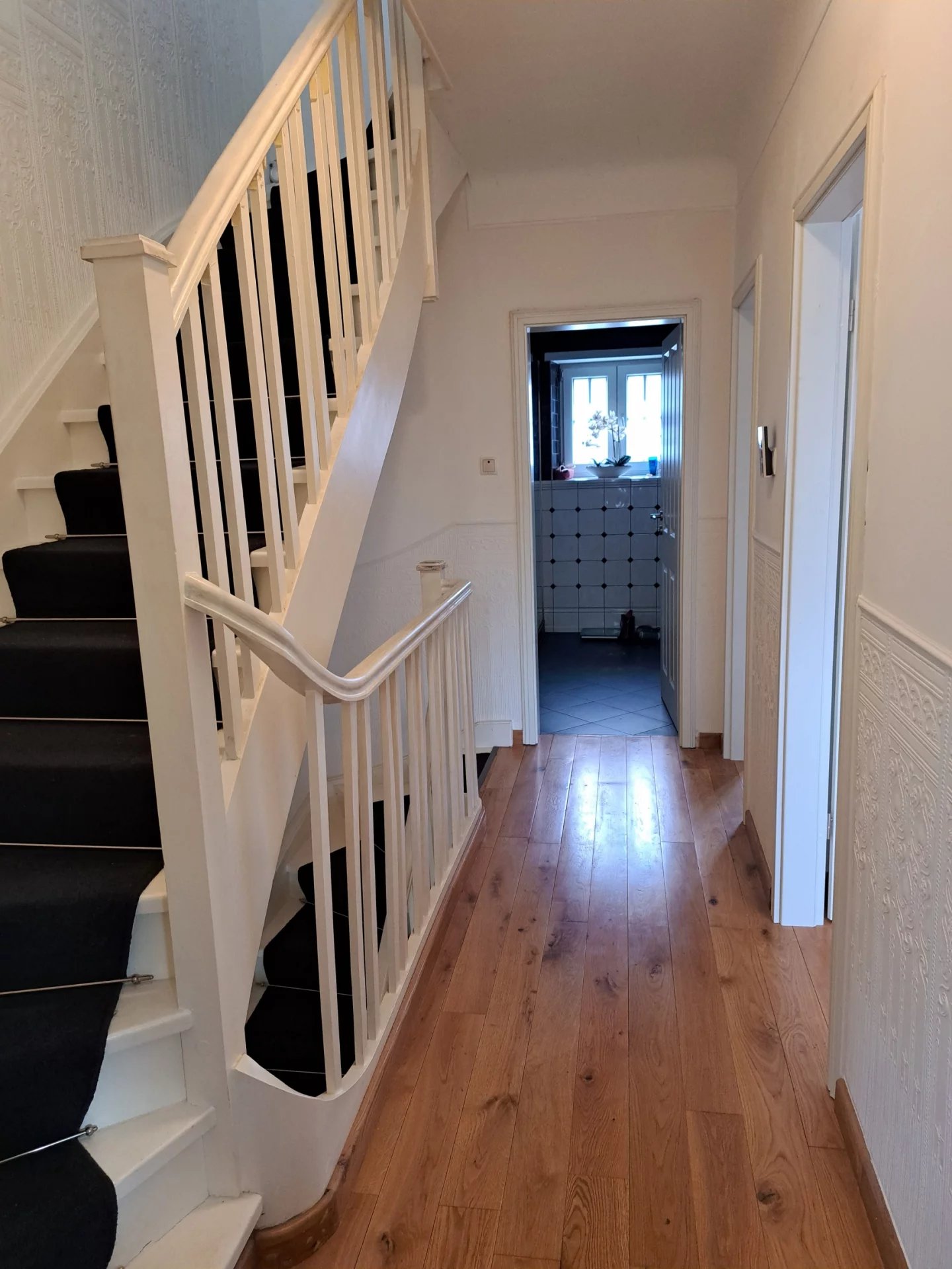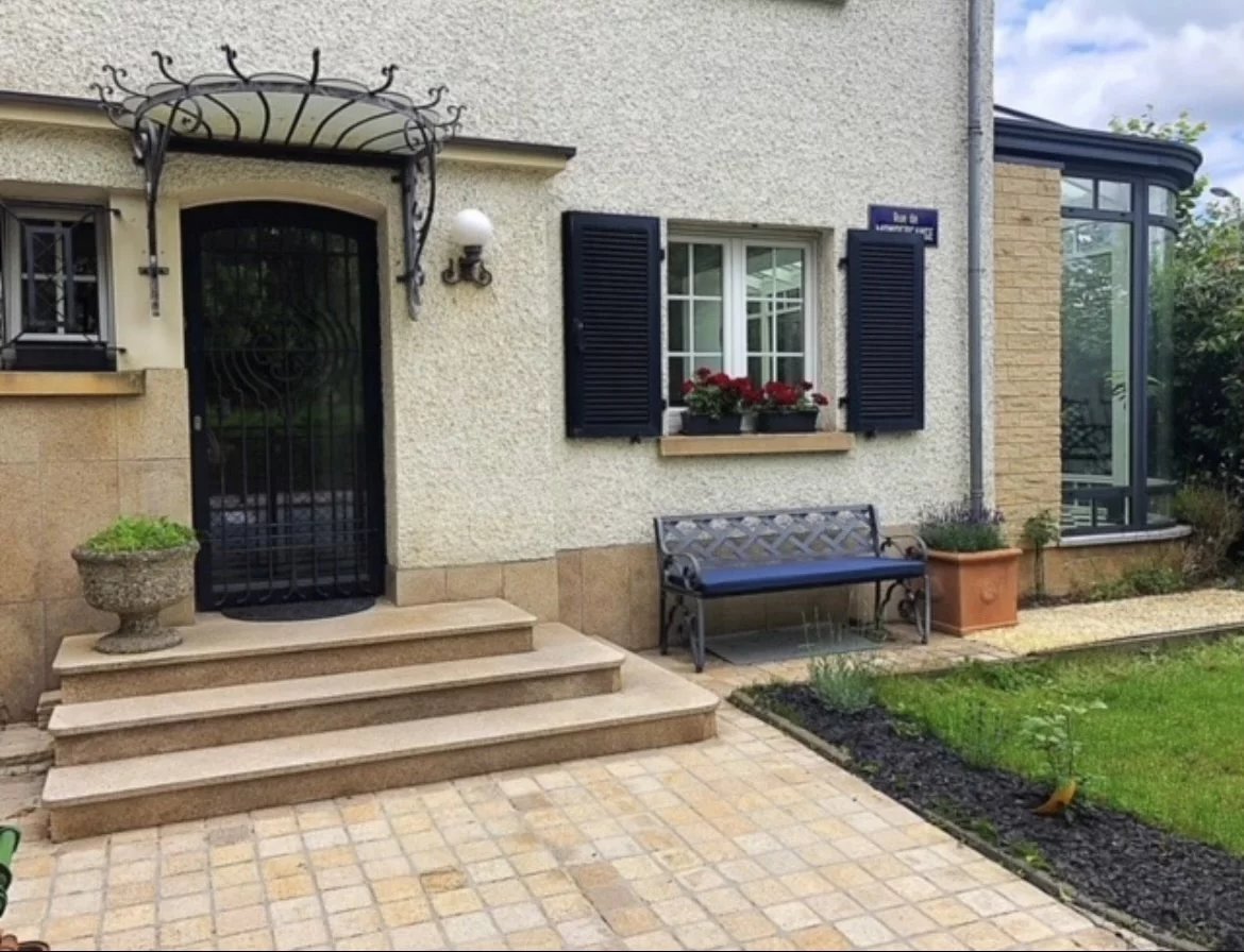 Hall d'entrée, cuisine équipée, salon- salle à manger avec cheminée du 19è siècle, véranda, 4 chambres à coucher, 2 salles de douche, 1 bureau, 3 WC's, caves, jardin, bon état, garage 6x4 m, terrasse, libre à convenir